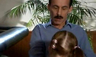 Fair haired filthy nubile with pigtails blows smelly penis of her old teacher