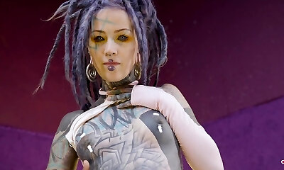 total woman monster with piercing and tattoos on the pussy pulls blank